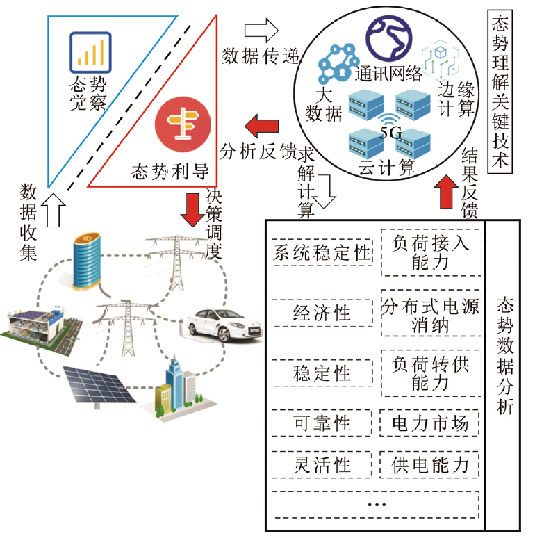 態(tài)勢理解是數(shù)據(jù)分析階段,深入理解與挖掘在態(tài)勢覺察階段中收集到的數(shù)據(jù),并從系統(tǒng)穩(wěn)定性、經(jīng)濟性、負載轉供能力、可靠性、靈活性、供電能力、負荷接入能力和分布式發(fā)電消納能力等方面分析智能配電網(wǎng)的運行態(tài)勢,其架構如下圖所示。態(tài)勢理解主要關鍵技術包括:不確定性潮流計算技術、混合狀態(tài)估計技術、配網(wǎng)彈性分析與自愈控制技術、配網(wǎng)可靠性與靈活性分析技術、配網(wǎng)協(xié)同調度技術、配網(wǎng)故障定位技術、電力市場技術、虛擬電廠技術、邊緣計算技術等。