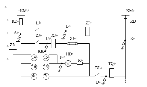 如圖所示,當直流接地發生在A、B兩點時,將電流繼電器觸點短接,而將出口中間繼電器ZJ啟動,ZJ觸點閉合而跳閘。A、C兩點接地時短接ZJ觸點而跳閘。在A、D兩點,D、F兩點兩點接地同樣都能造成斷路器跳閘。