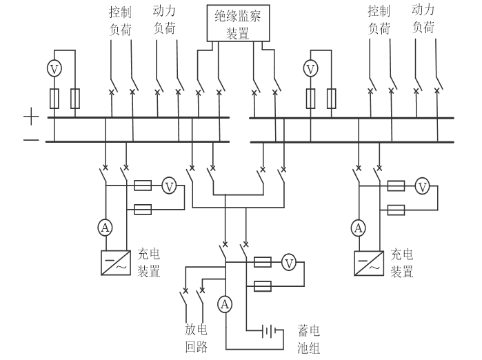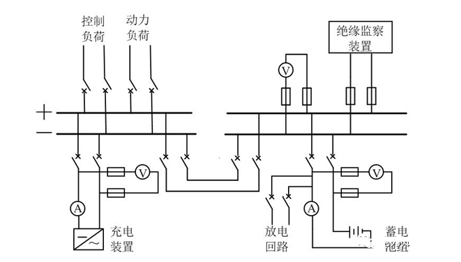 單組蓄電池和充電裝置接到同一母線上,母線上只裝設一套絕緣監察裝置和電壓表,接線簡單,可靠性低。在110kV及以下變電站有采用。