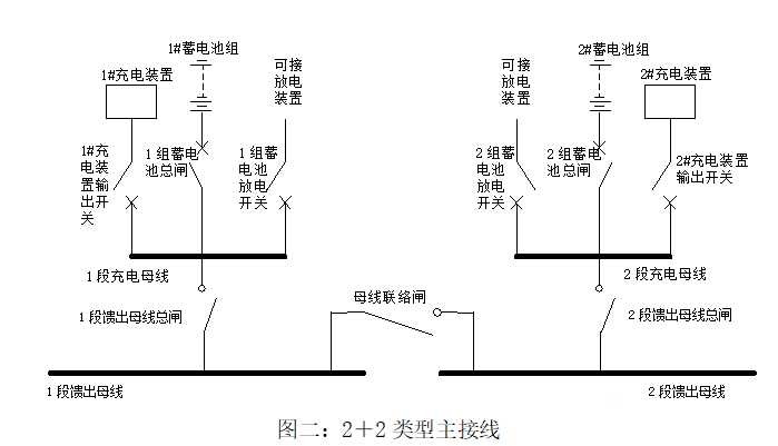 高頻開關電源,現在廣泛使用,220kV及以上變電站或重要的110kV變電站直流系統,也常采用如下接線方式(簡稱2+2方式)