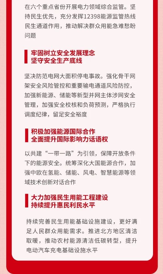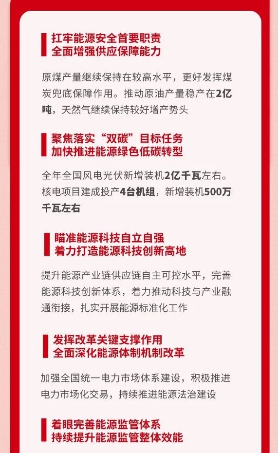 會議強調,2024年能源工作要堅持以習近平新時代中國特色社會主義思想為指導,深入落實習近平總書記重要指示批示精神和中央重大決策部署,堅持以黨的創新理論引領能源高質量發展新實踐,全面貫徹黨的二十大和二十屆二中全會精神,深入落實中央經濟工作會議決策部署,認真落實全國發展和改革工作會議要求,全面加強黨對能源工作的領導,堅持穩中求進工作總基調,完整準確全面貫徹新發展理念,加快構建新發展格局,統籌高質量發展和高水平安全,深入推進能源革命,加快建設新型能源體系、新型電力系統,加強能源產供儲銷體系建設,在新的歷史起點上推動能源高質量發展再上新臺階。一要扛牢能源安全首要職責,立足我國能源資源稟賦,堅持穩中求進、以進促穩、先立后破,全力抓好能源增產保供,持續提高能源資源安全保障能力。二要聚焦落實“雙碳”目標任務,持續優化調整能源結構,大力提升新能源安全可靠替代水平,加快推進能源綠色低碳轉型。三要瞄準能源科技自立自強,深入實施創新驅動發展戰略,完善能源科技創新體系,著力推動科技與產業融通銜接,扎實開展能源標準化工作,提升能源產業鏈供應鏈自主可控水平,著力打造能源科技創新高地。四要發揮改革關鍵支撐作用,落實關于構建全國統一大市場等有關工作部署,積極推進電力市場化交易,持續推進能源法治建設,深化能源領域體制機制改革,不斷提升能源治理能力水平。五要著眼完善能源監管體系,健全完善能源監管制度,創新開展過程監管、數字化監管、穿透式監管、跨部門協同監管,加大監管工作力度,有效維護公平公正市場秩序。六要牢固樹立安全發展理念,嚴格落實“三管三必須”,以“時時放心不下”的責任感抓好安全生產,堅守安全生產底線。七要積極加強能源國際合作,以共建“一帶一路”為引領,充分利用國際國內兩個市場、兩種資源,保障開放條件下的能源安全,全面提升國際影響力話語權。八要大力加強民生用能工程建設,推進北方地區清潔取暖,推動農村能源清潔低碳轉型,提升電動汽車充電基礎設施水平,更好滿足人民群眾用能需求。九要全面加強黨的建設,強化黨的創新理論武裝,落實巡視整改責任,加強基層黨組織建設,建設高素質專業化能源干部隊伍,以高質量黨建引領能源高質量發展。